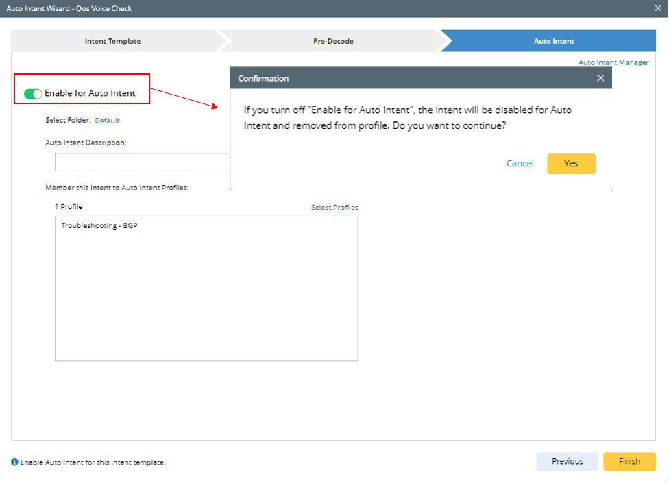 A power user can disable the intent template for Auto Intent by turning off the Enable for Auto Intent toggle button at the top of the Auto Intent tab. A confirmation message box appears to verify the action.