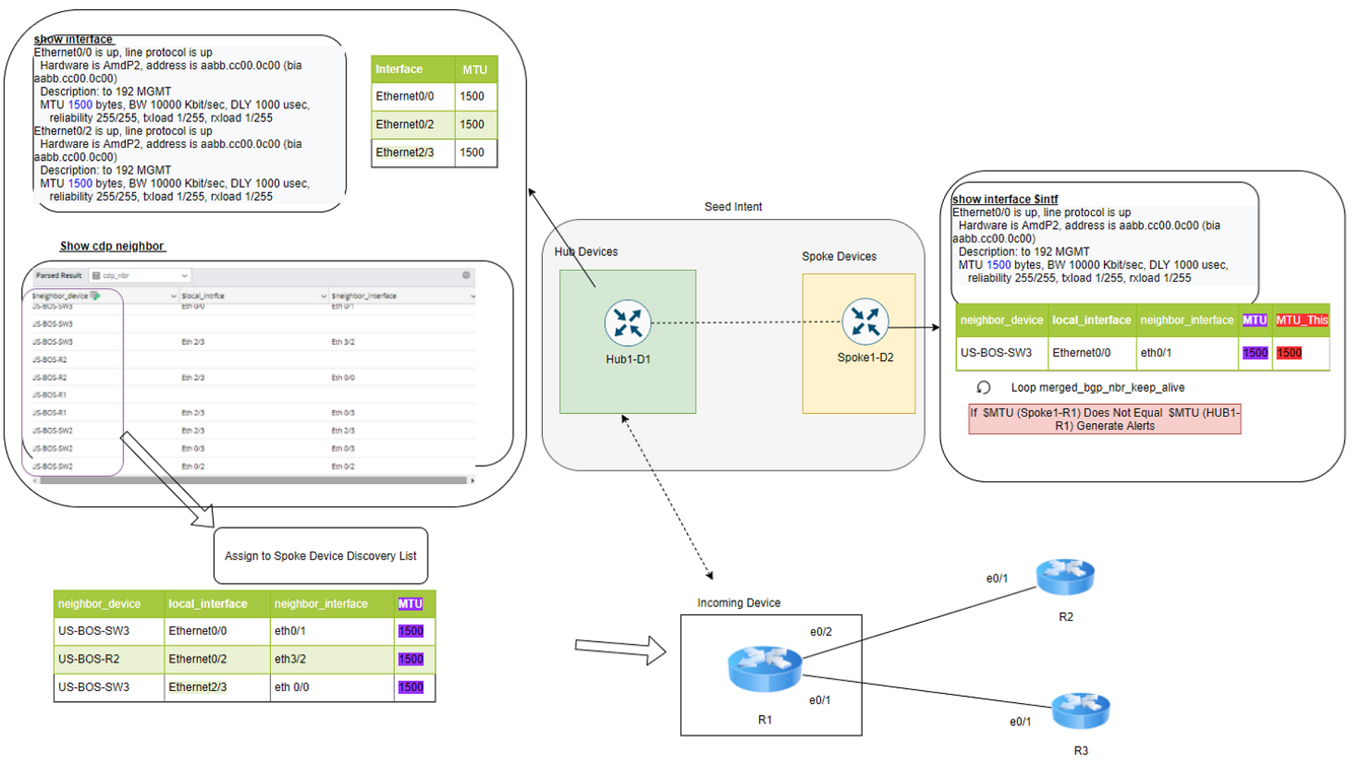 With “R2” and “R3” discovered as spoke devices, they will both be used to match Spoke1-D2 to see whether there’s a match. And the spoke parameters (show interface $interface) are replaced with the real value used in the CDP neighbor. -