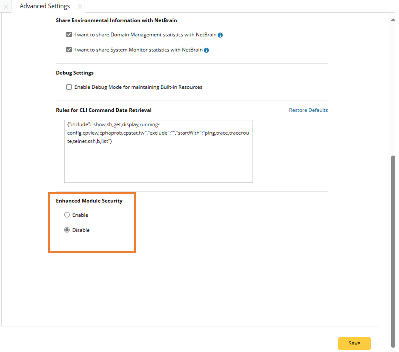 - Enable: If Enhanced Module Security is enabled, NetBrain will forbid the OS-level python functions throughout system, which will affect modules including Qapp, parser, Plugins, Parser.