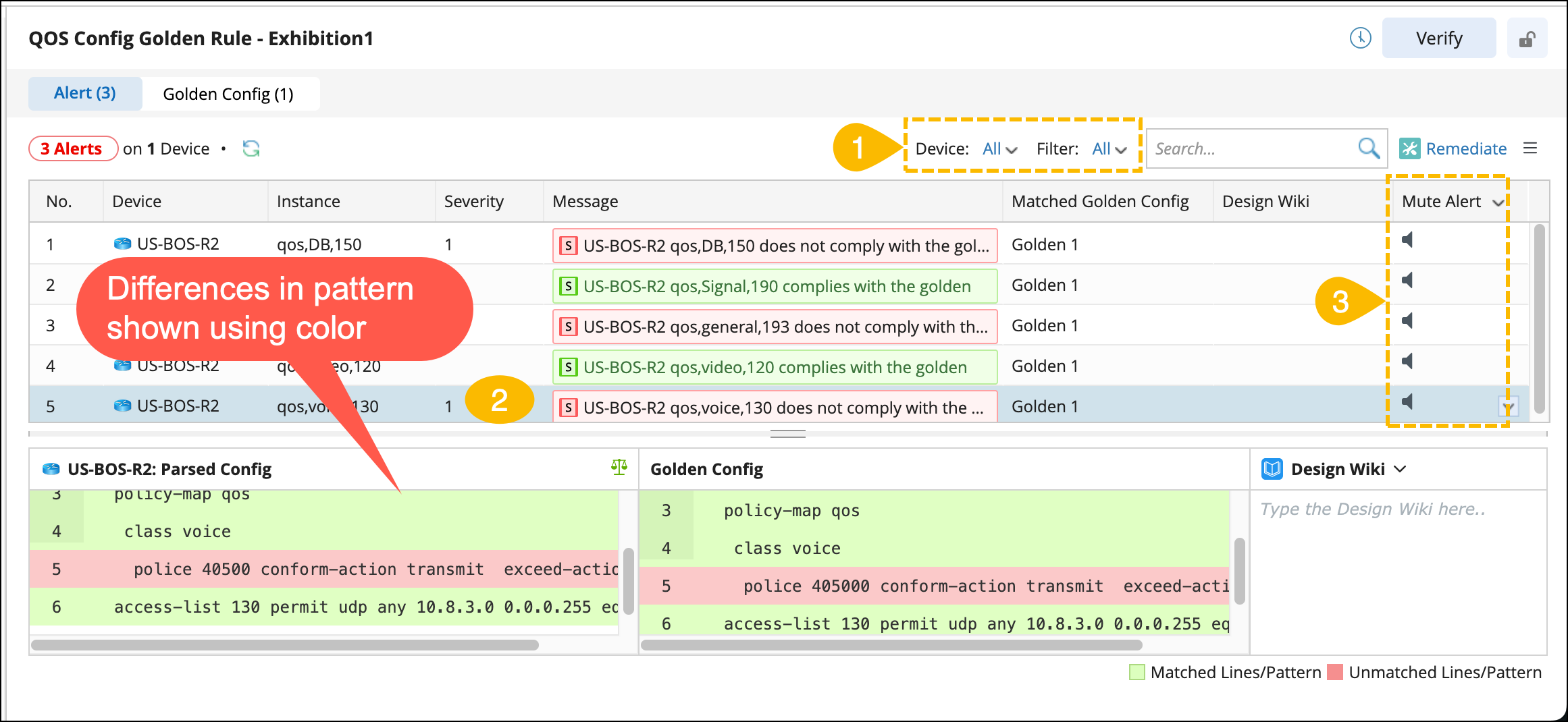 For each alert, you can view the differences between the device’s actual config and the expected golden config as follows: