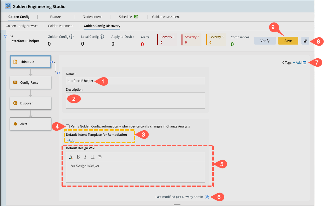 It is the first step in the Golden Config discovery process. Define the basic information, such as the Name and Description of the golden config rule.