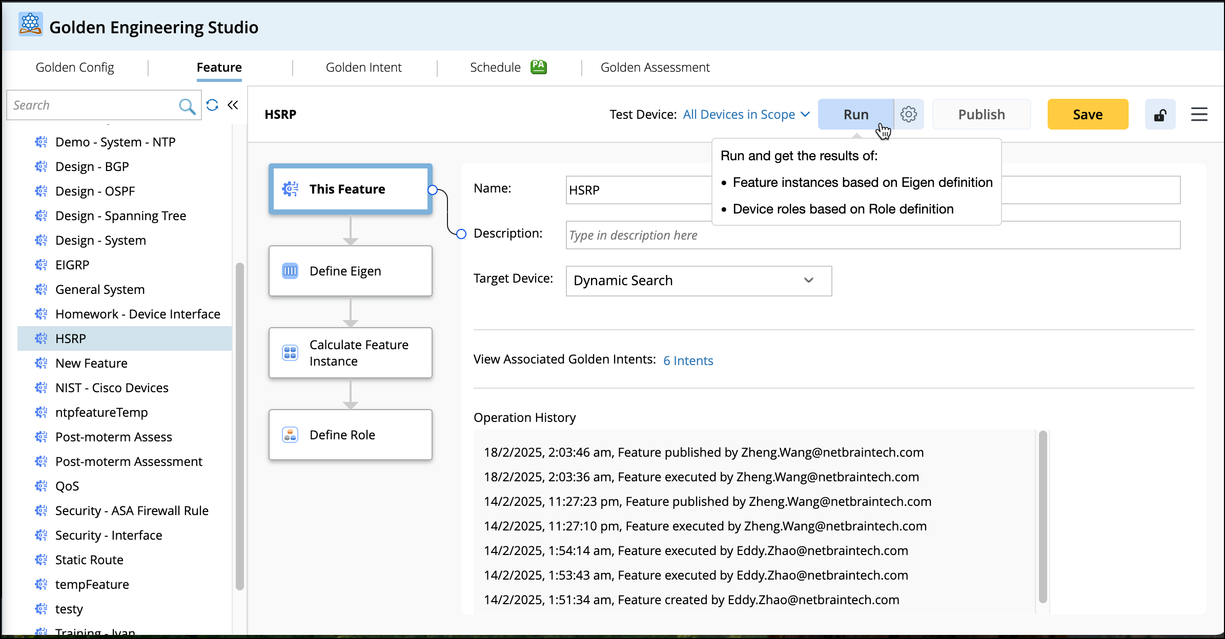 Golden Feature (GF) is one of the key components in the Golden Engineering Studio (GES). It is designed to decode and identify the network technologies operating within each customer’s network. GF also serves as the foundation for Golden Intent, enabling more accurate network analysis and management. The detailed procedure to create, publish, settings and access control of the golden feature is discussed in the following topics: