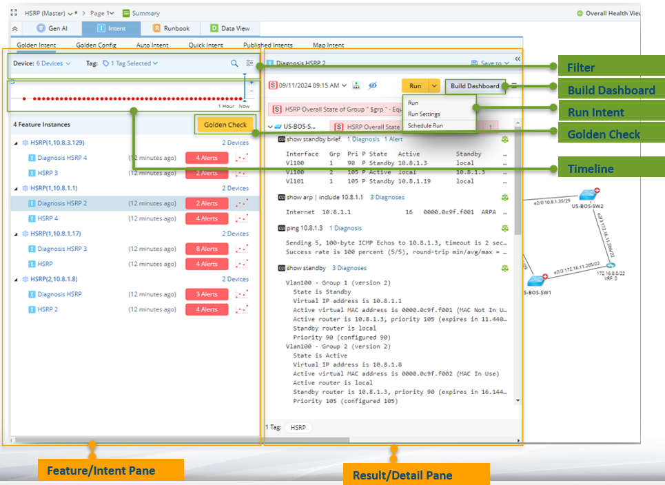 After the Golden Intents are published, you can view the diagnosis results directly in the Golden Intent pane on the map. You can filter the list of member intents in this pane using the filters Devices, automation Tags, and features/golden intents. And then you can Run the intent and view the results, and build a observability dashboard for the map. The main UI and functions in the Golden Intent pane are as follows: