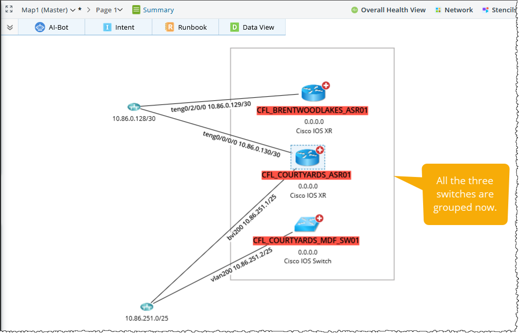 Map elements can be grouped based on their shared attributes. To access this feature, right-click in an empty area of the map and select the "Group Layout" menu. This menu displays the available grouping properties based on the types of objects present on the map, such as Physical Devices or Cloud Devices.