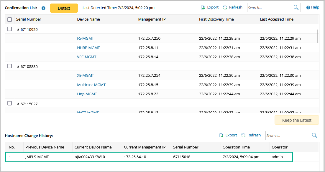 1) Click Detect to list the devices with the same serial number but different hostnames.