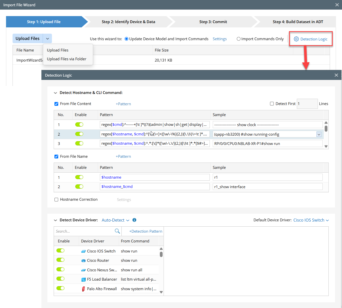 The file can include the output of multiple commands (for example, the output of the CLI command show tech) or the device configurations (for example, the output of the command show run for Cisco devices). The file name can be <hostname>.txt or <hostname>_<command name>.txt. The system can detect the hostname from the file name or the file contents and detect logic defined in the Detection Logic setting, which you can modify.