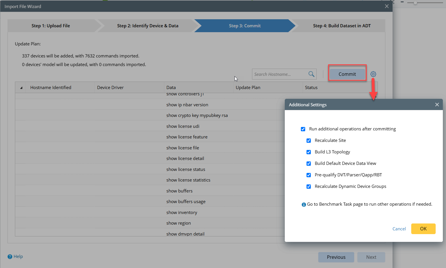 In this step, you commit to importing the data to the system. After the commit button is clicked, the system will parse the configurations and CLI command data with the driver and build the corresponding device models into the current domain, including device properties, L3 topology (L2 topology is not built by default), etc.