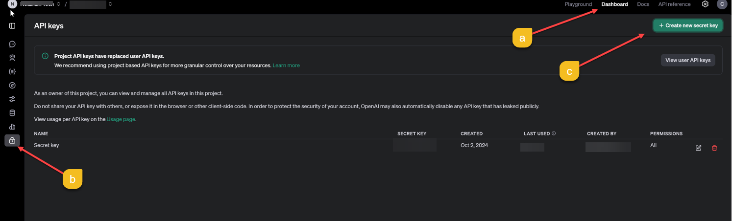 Tip: An OpenAI API key is a unique identifier used to authenticate requests associated with your project. - Navigate to Dashboard.