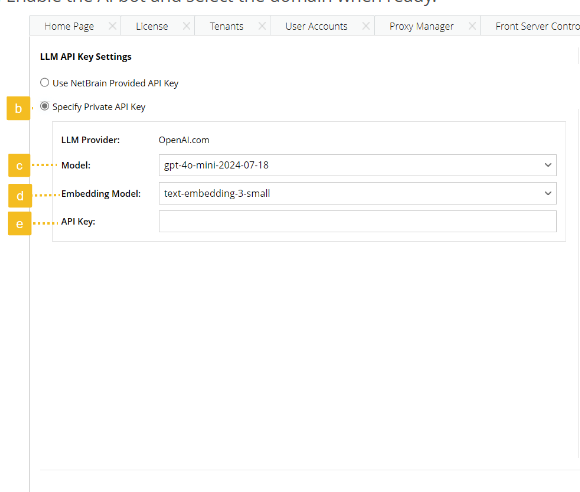 - After NetBrain enters the OpenAI API key into the system, you can monitor the usage and select which domain to enable.