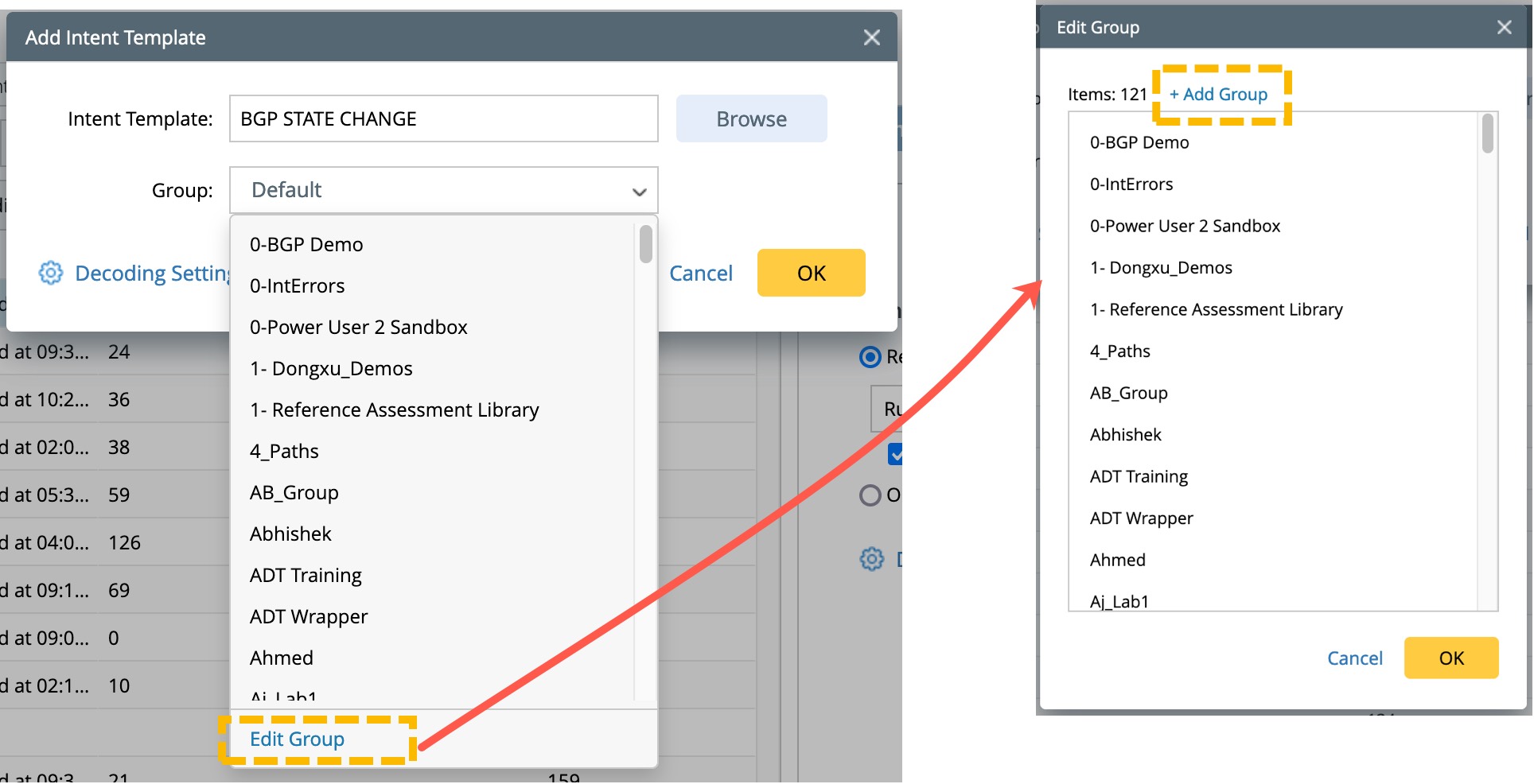Note: Cloned intents and member intents of NIC cannot be selected. - In the Group field, select a group for organizing the intent template to be added to the IBA Center. If you do not select a group, the intent will be placed in the built-in Default group.