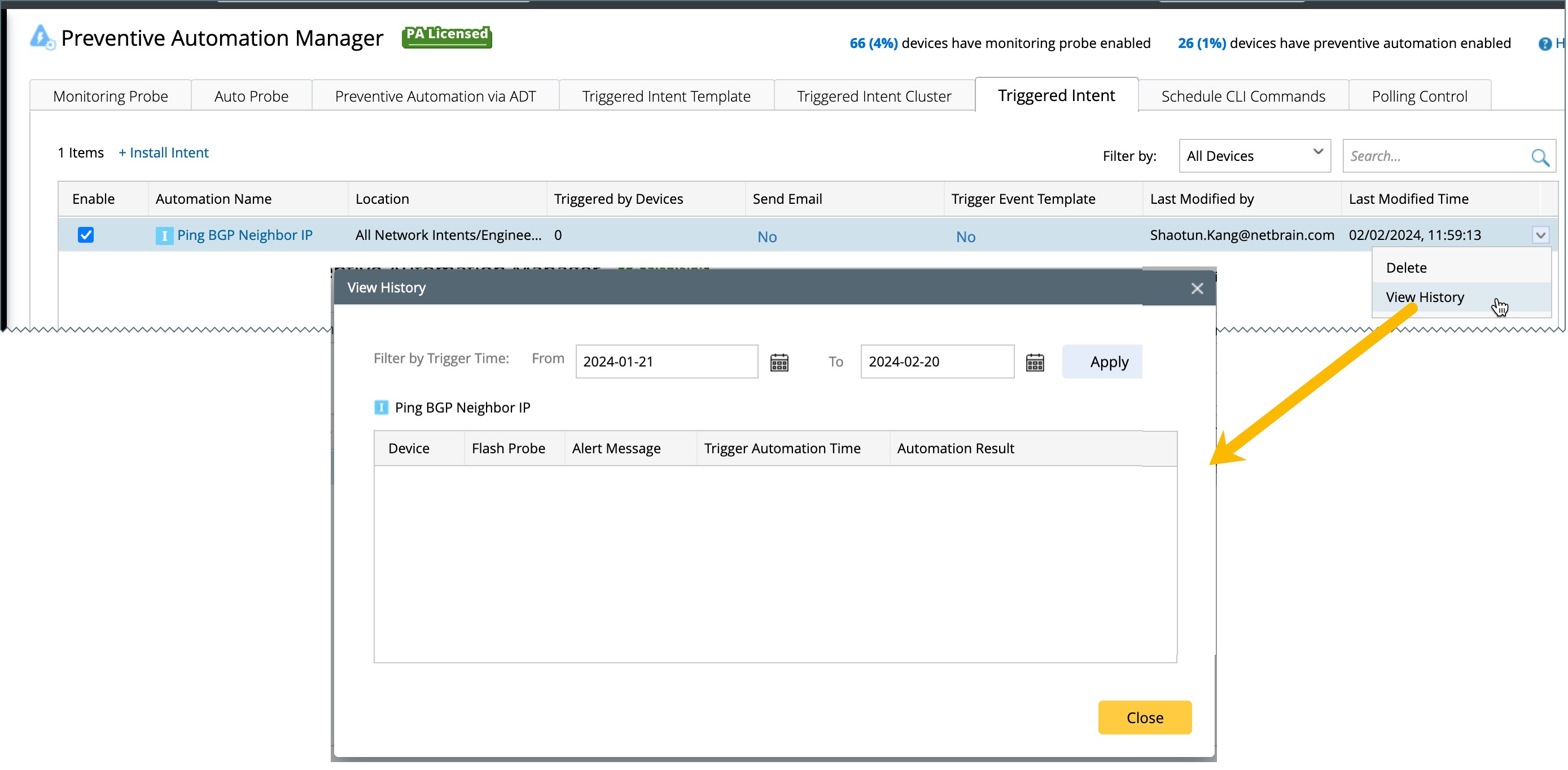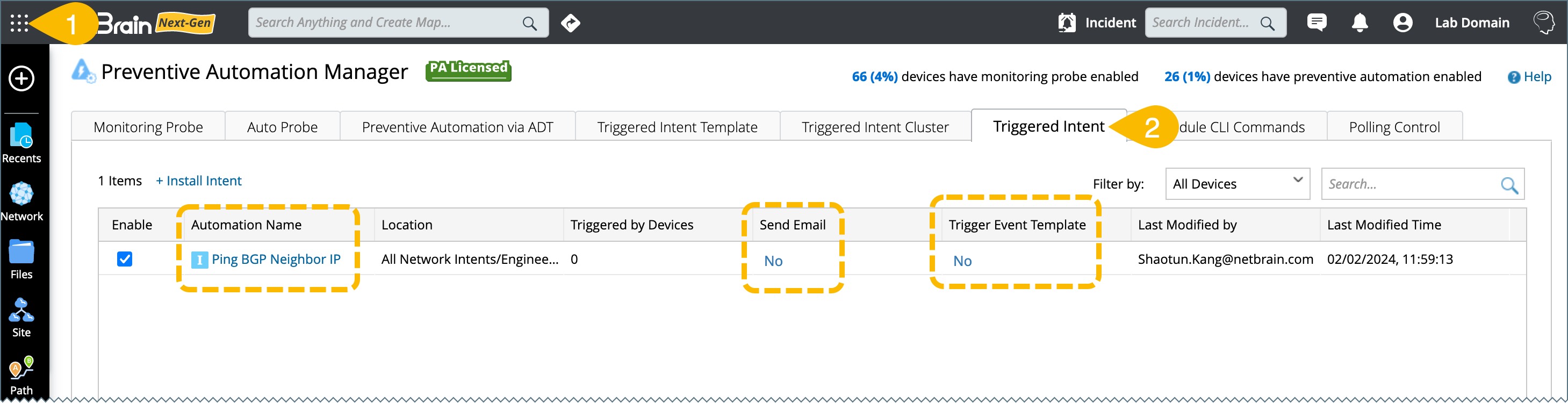 - Navigate to the Triggered Intent tab of Preventive Automation Manager.