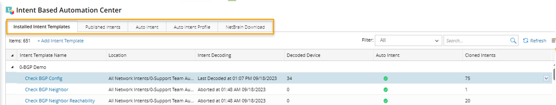 In NetBrain, you can define a Network Intent Template (NIT) for an intent to clone it across the network system. Accordingly, Intent Based Automation Center (IBA center) is provided in the system, serving as a central console for carrying out various operations such as decoding and installing intent templates, enabling NIT/ADT for Auto Intent, managing assets in NetBrain Download, and managing published intents.