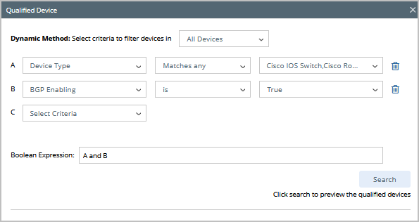 Define the qualified devices via conditions. Select All Devices, then define the conditions and expression. For more information, see Dynamic Search.