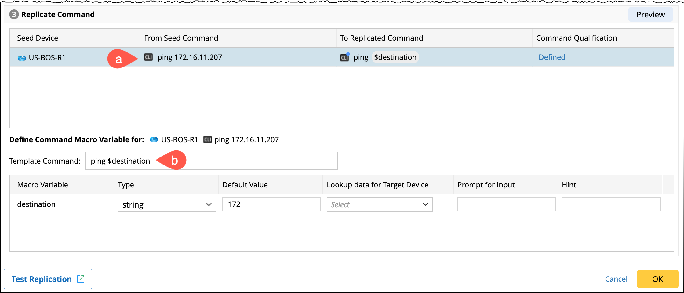 - Select a seed device entry, and a section to define the Command Macro Variable will appear at the bottom.