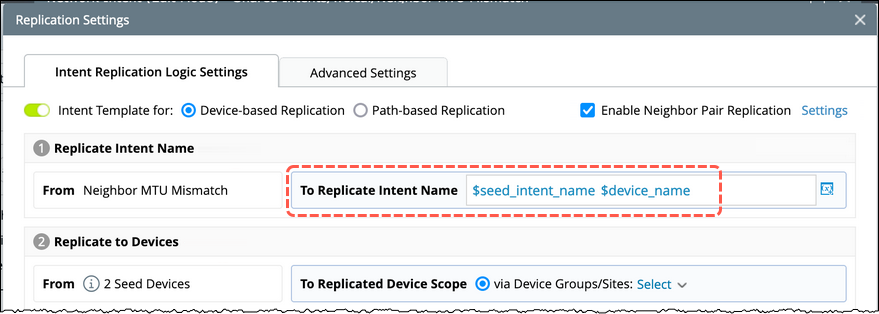 The default naming convention uses a predefined format that combines the seed intent name and device name. You can customize this format by including diffrent variables in the naming pattern.