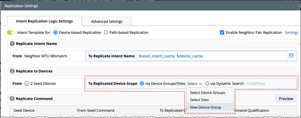 In the Intent Replication Logic Settings pane, the settings are disabled by default. To define an intent template, toggle the Intent Template radio button to enable the intent to serve as a template. Once it is enabled, all replication logics and dialogs will be enabled. The intent templates are categorised into two types based on replication logic definition: Device-based Replication (called normal NIT) and Path-based Replication.