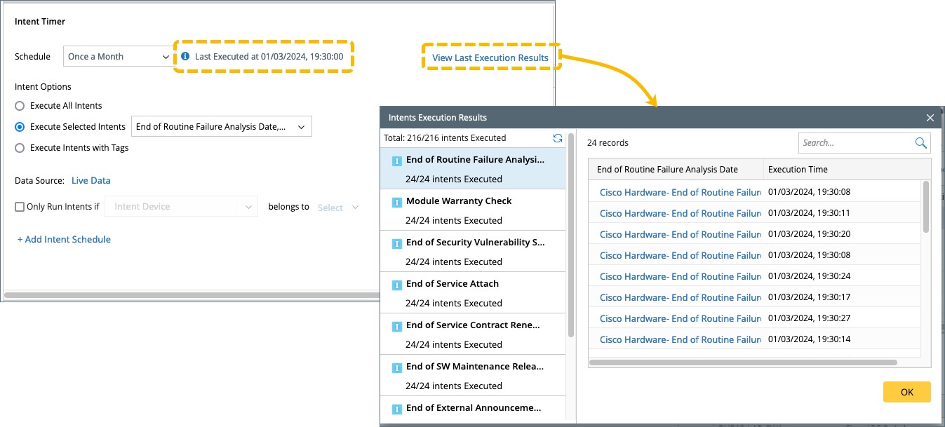 Running intents once or via timer is not controlled by schedule task, therefore, the system provides the function of "View Last Execution Results" to get the record of the last execution.
