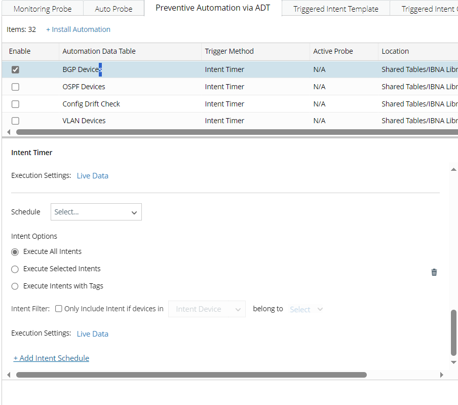 Some ADTs may not be triggered by looking glass probes or primary probes. Instead, you can use the intent timer to run the intents of the ADT table periodically. Configure the ADT to be triggered by the intent timer with the following steps: