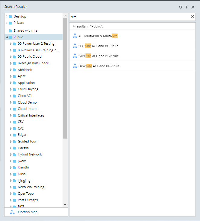 - Function Map — a central place to manage and display all types of maps, including Common Map, Site Map, Device Group Map, Path Map, Intent Map and Member Intent Map. It is located at the bottom of the Files pane.