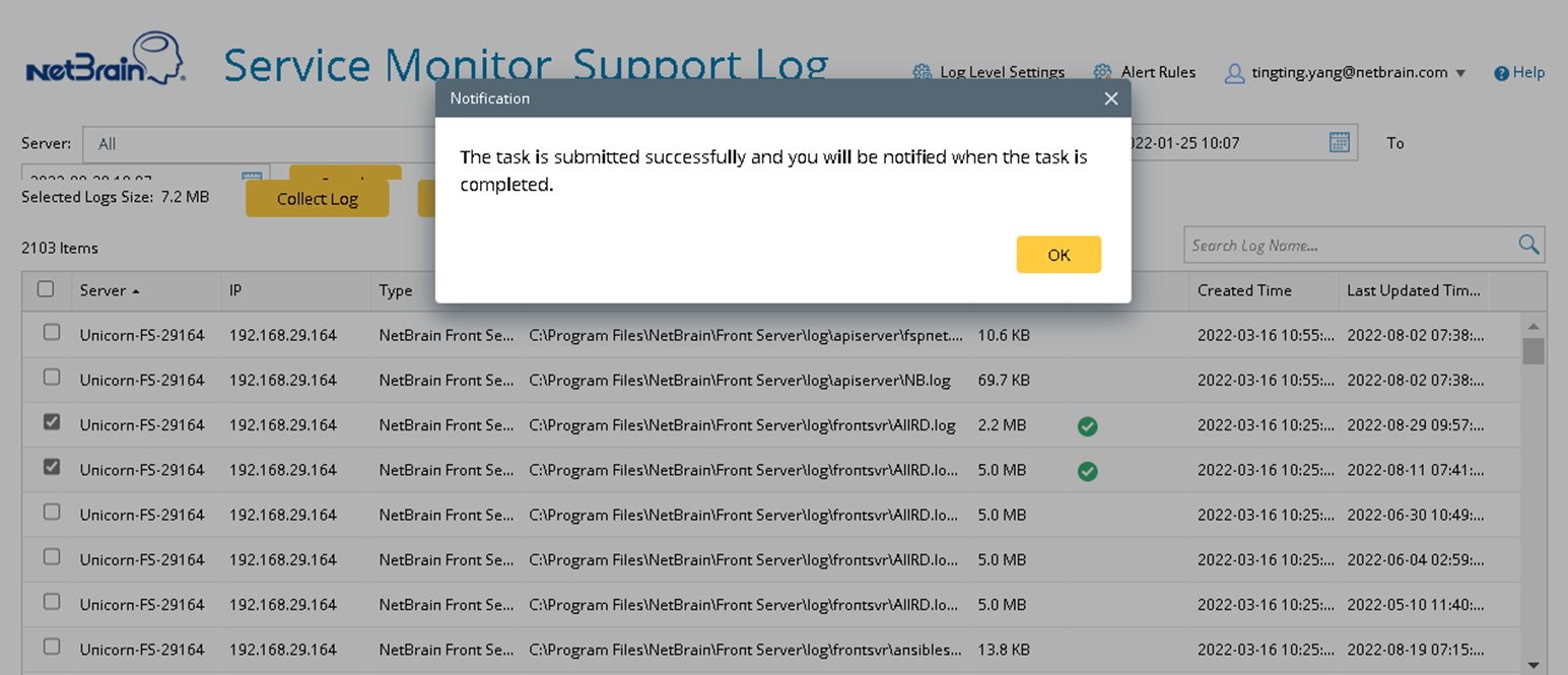 after successful log collection. An email notification is also automatically sent.