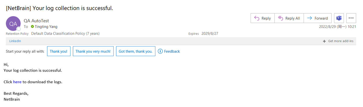 - Receive email. An email is sent to report the log collection results.