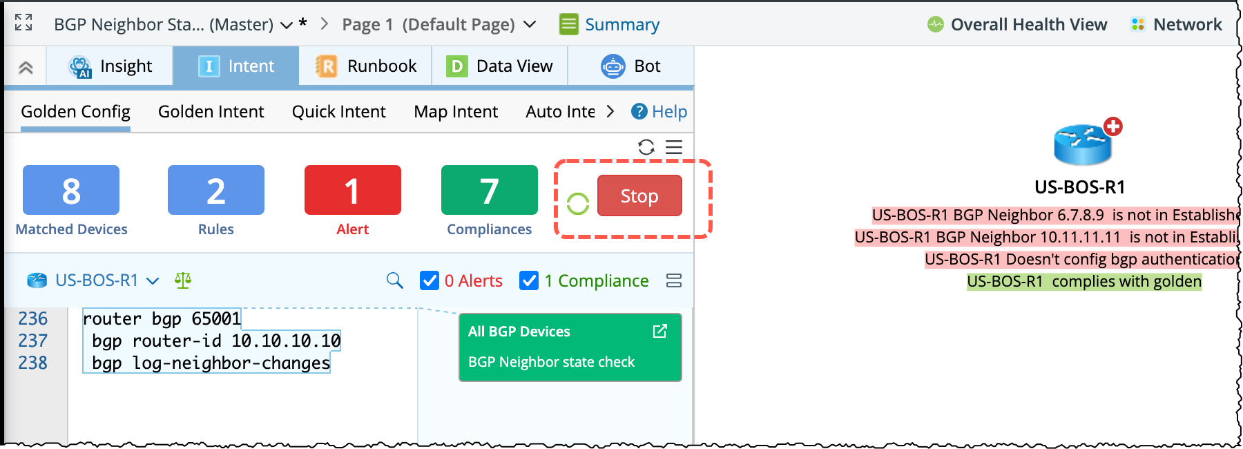 Golden Config Rules can be manually verified in batch from the Golden Config pane and get the latest results. The summary information in this pane will be updated once after successful verification. To verify the golden config rules, click the Verity button located at the upper-right corner of the left pane. The verification will be processed following the below rules: