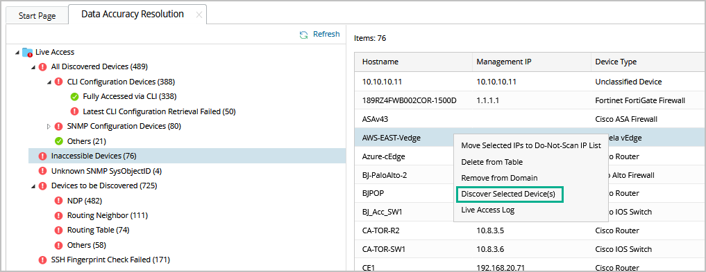 If these devices are rediscovered successfully, they can be automatically moved from the Inaccessible Devices category to the Fully Accessed via CLI category. Otherwise, you can manually remove, delete, or move them to the Do-Not-Scan IP list. See more details in Do-Not-Scan list.