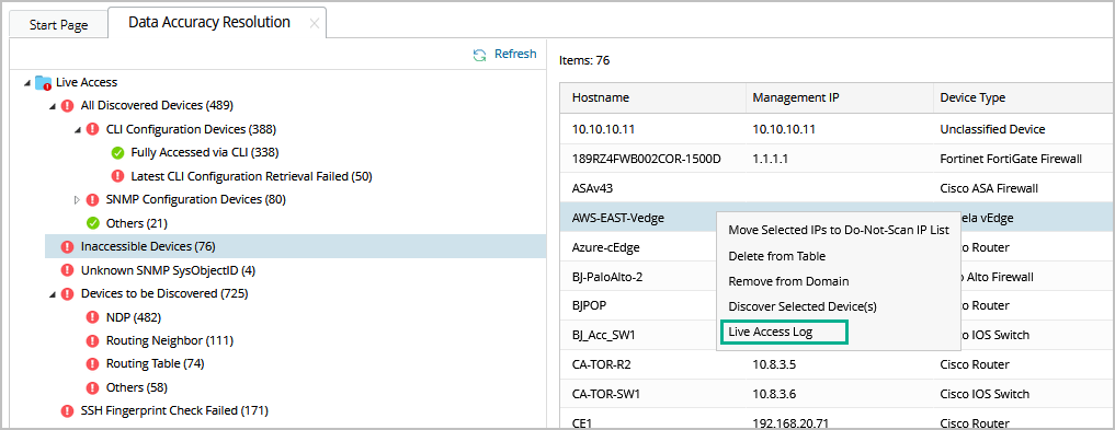 Inaccessible Devices refer to the devices in the current domain which cannot be accessed via SNMP and CLI. You can check whether there are any inaccessible devices in the Data Accuracy Resolution.