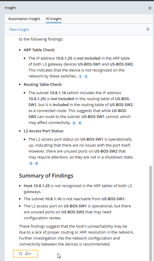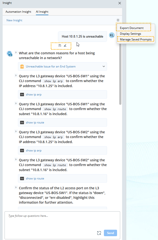 - New Insight. If you want to ask a question outside the current context, you need to click New Insight to start a new session. For example, if users ask the LLM to summarize the previous results for certain devices, they need to start a new session to inquire about unreachable hosts across the network.