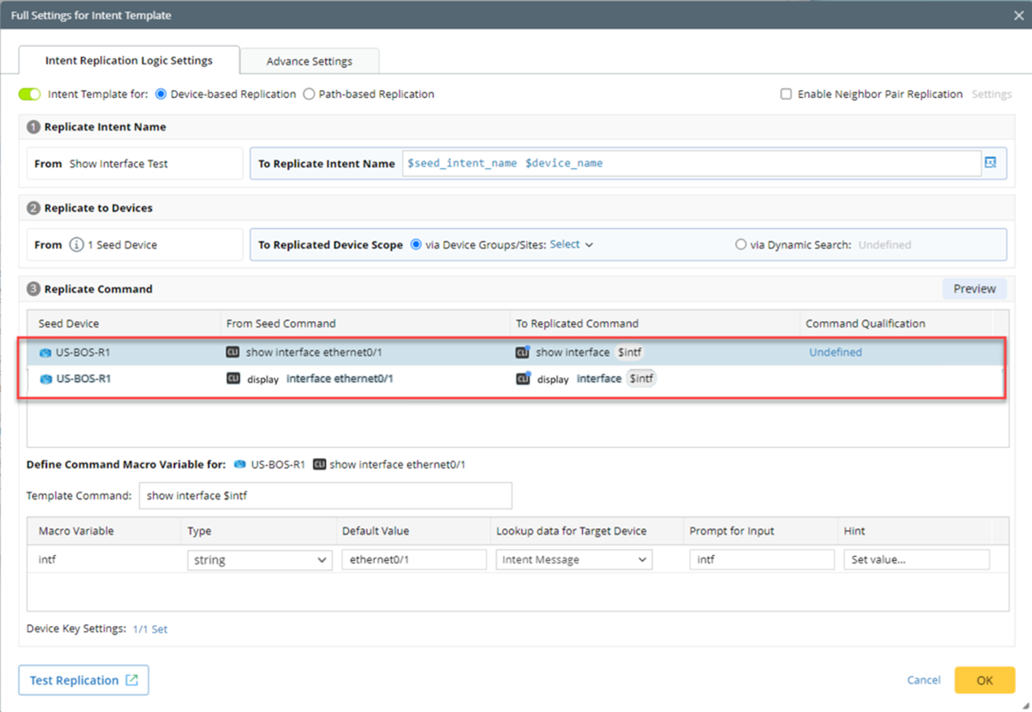 When defining Command Macro Variable in Intent Replication Logic Settings in NI, each device command section may contain several CLI commands, and users can define command macro variable for each CLI command. It is noted that the command macro variables defined for different commands in the same command section must be the same.