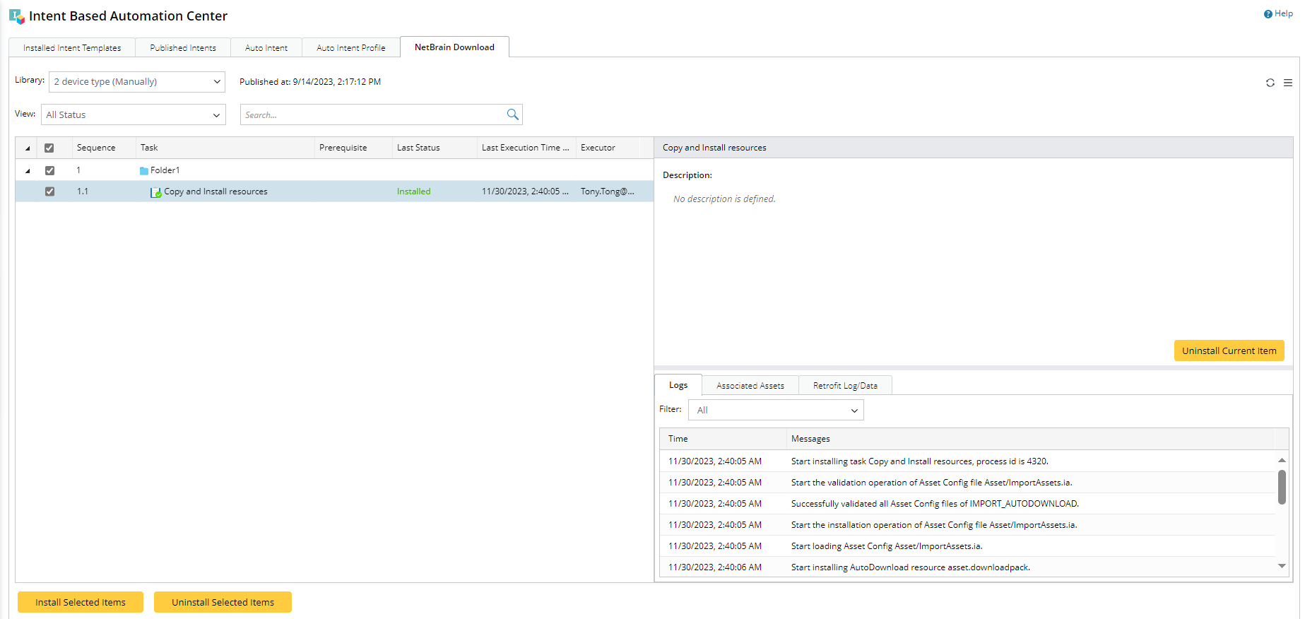 The system enables users to view and manage the Configure Orchestration Tasks in different libraries in NetBrain Download. You can select Orchestration Tasks in your domain and install automation assets in batch.