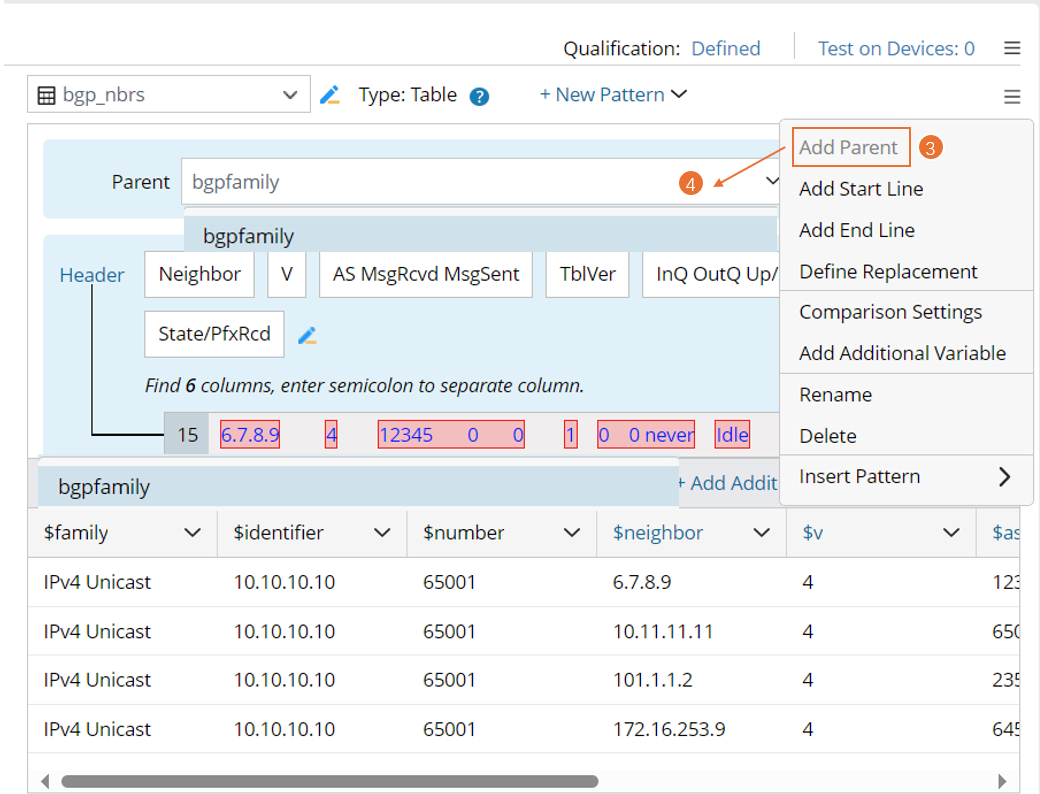 - In the bgp_nbrs pattern, click Add Parent to add the parent paragraph.