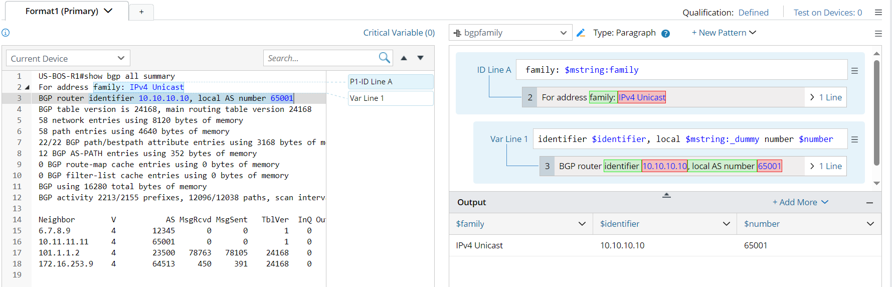 - Define parent paragraph bgpfamily to parser variables $family, $identifier and $number.