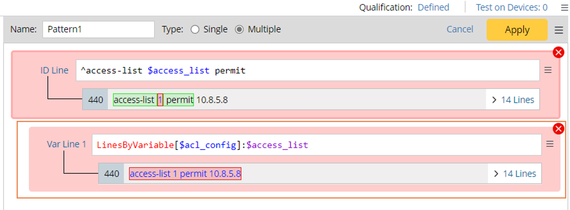 Example 1: Parse the lines containing a single variable, e.g., parse acl config per line.