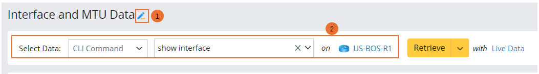 - Define the settings for collecting CLI Command data. In this example, select CLI Command of show interface as the retrieved command data and select the device US-BOS-R1 to retrieve data on it.