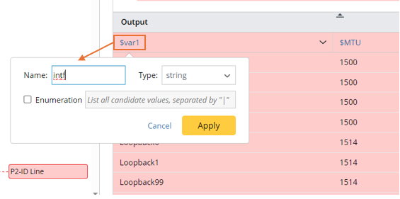 - Double-click Ethernet0/0 in line 2, then continue to double-click 1500 in line 5 to parse the variables $intf and $MTU in the Auto Parser mode.