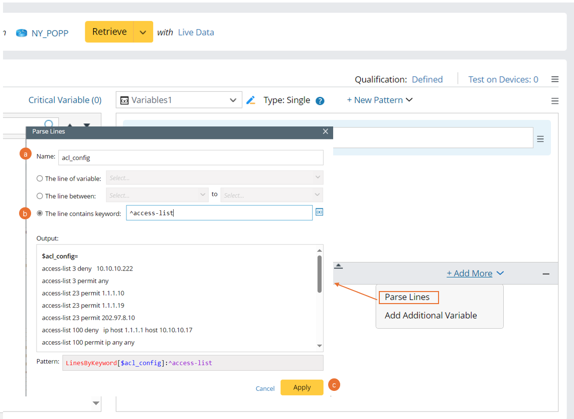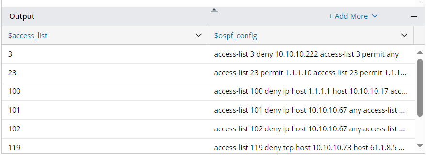 Example 2: Parse the lines containing keywords (insert a variable template). In this example, we will parse acl_config for each access-list id.