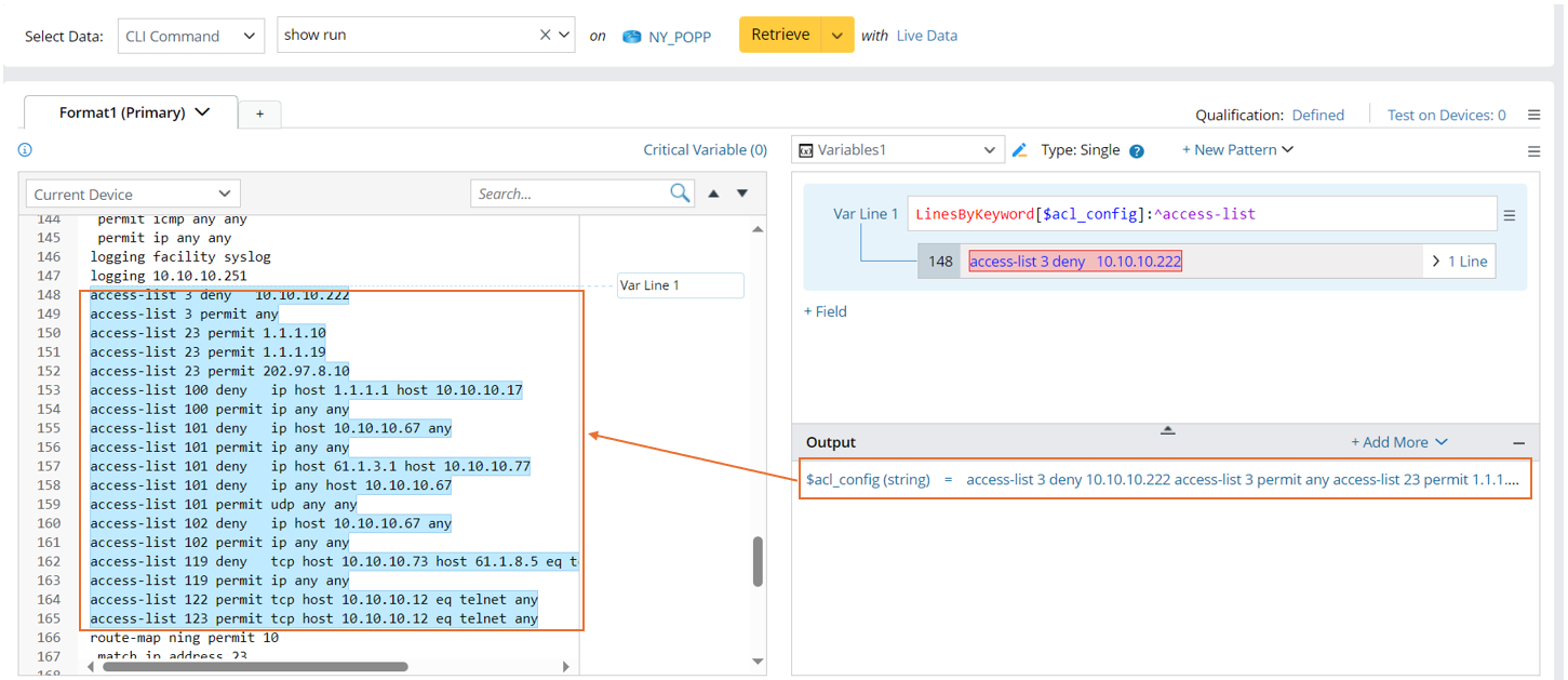 Example 1: Parse the lines containing one keyword, e.g., parse all access-list to one variable.