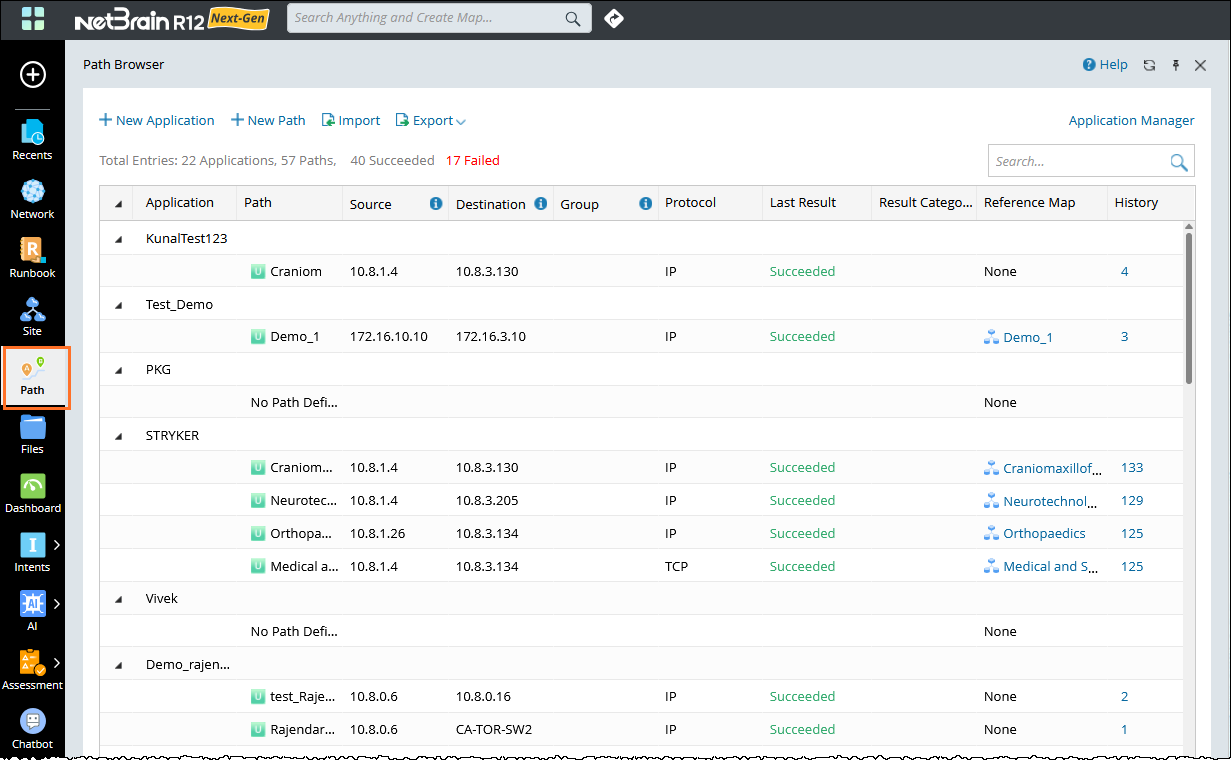 The Path Browser provides a centralized interface to view, manage, and track all saved paths across applications. It displays key details such as source and destination IPs, protocol type, path execution status, reference maps, and execution history. From this view, you can quickly assess which paths have succeeded or failed, access detailed results, and perform actions such as importing, exporting, or creating new paths.