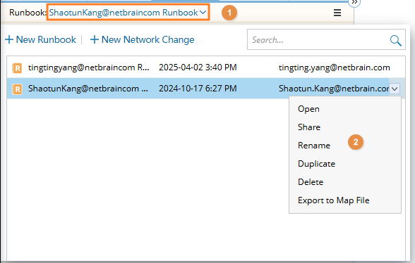 The system creates a built-in runbook for each map to accommodate all automation actions executed by a specific user when no runbook is open. The built-in Runbook is named with the current login email address, which means each user can have a personal runbook on each map.
