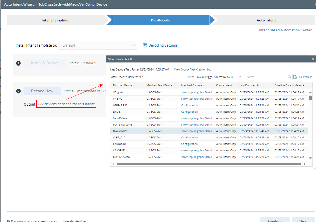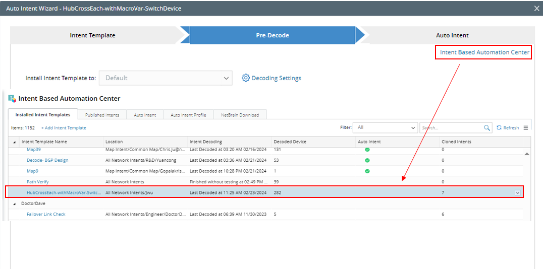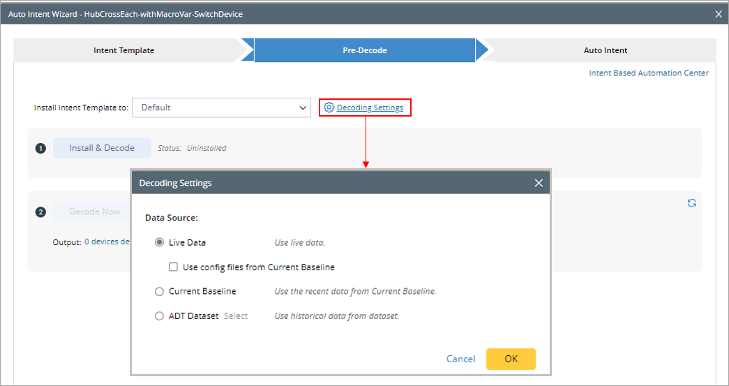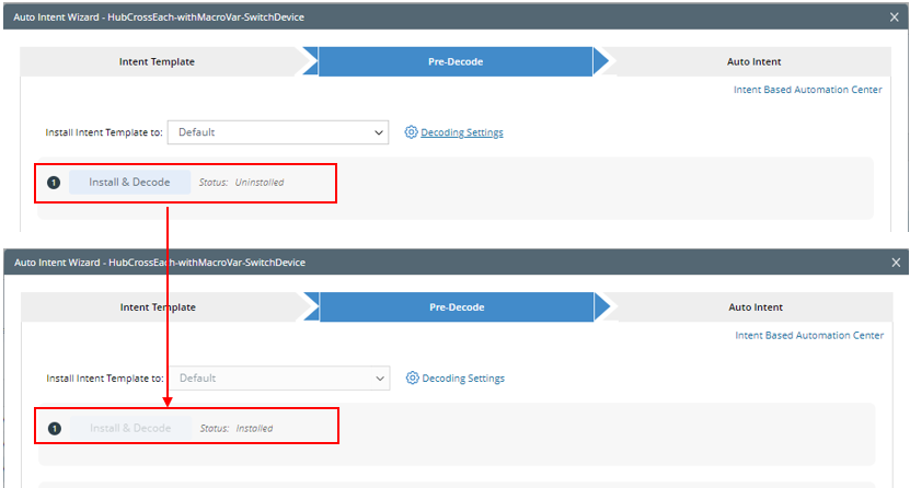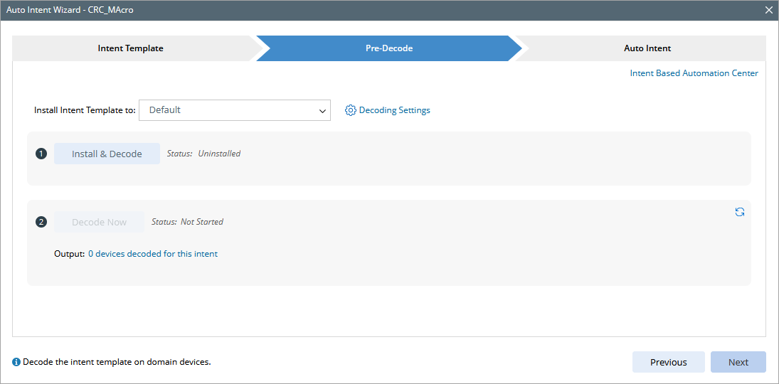 You can install and decode intents in the Pre-Decode tab. Before you can use an intent in the Auto Intent step, you must first decode it in this tab. This decoding process is required because an intent must be installed in the IBA Center before it can be enabled for auto intent.