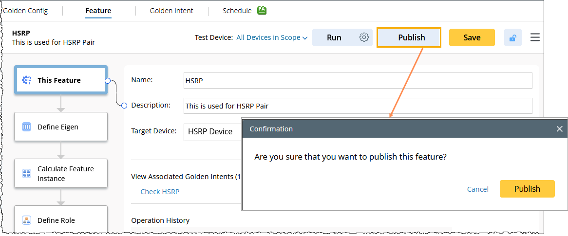 The Publish button will be enabled after the feature is executed using the Run button with the Test Device selection as All Devices in Scope. Once the feature has been published to the production environment, feature instance data can be used to build member intents with the specified GI.