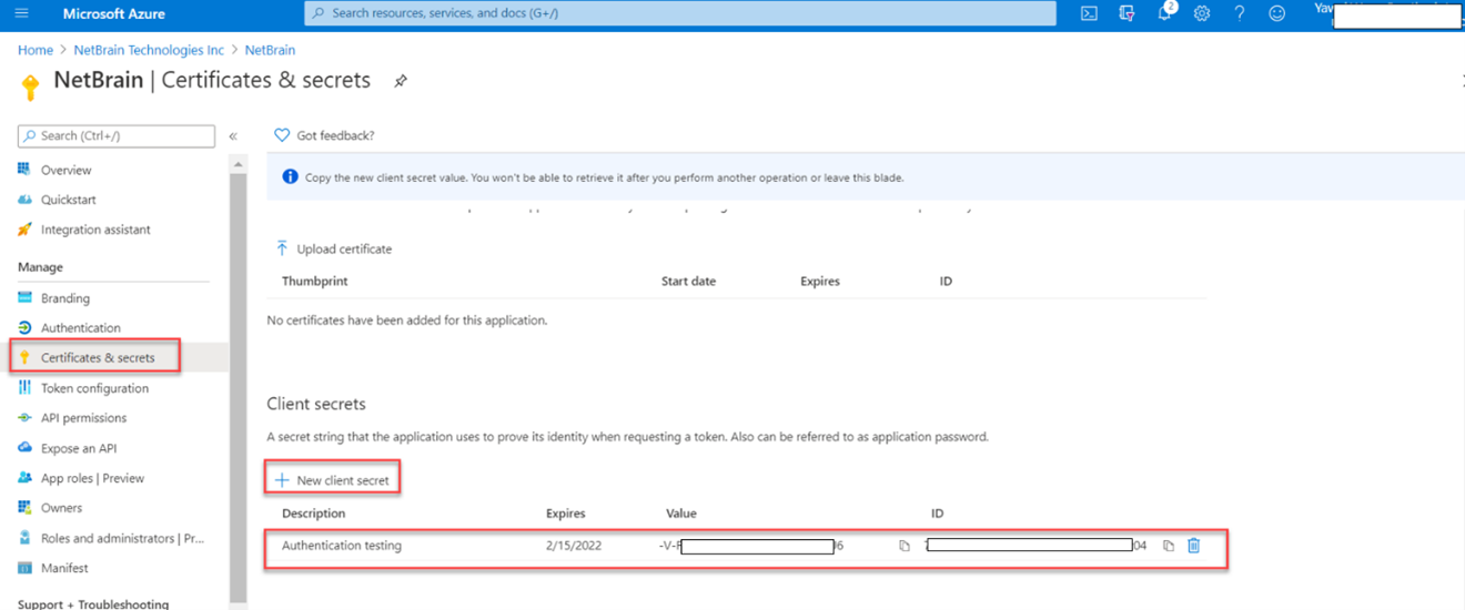 - Go to Certificate & secrets within the created App to add a new client secret. The value of the newly created client secrets will be used to set up the NetBrain external API server later.