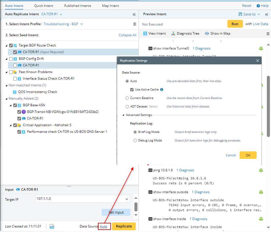 - Auto: The system will first search for pre-decoded data for intent replication. If pre-decoded data is not found, the system will retrieve live data and use the retrieved data for intent replication.