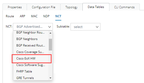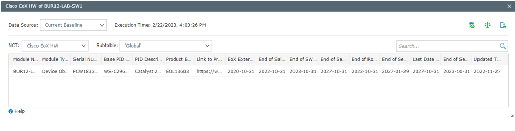 NetBrain includes the following information in the Cisco EoX HW NCT table.
