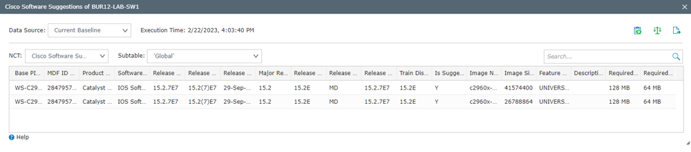 NetBrain includes the following information in the Cisco Software Suggestions NCT table.