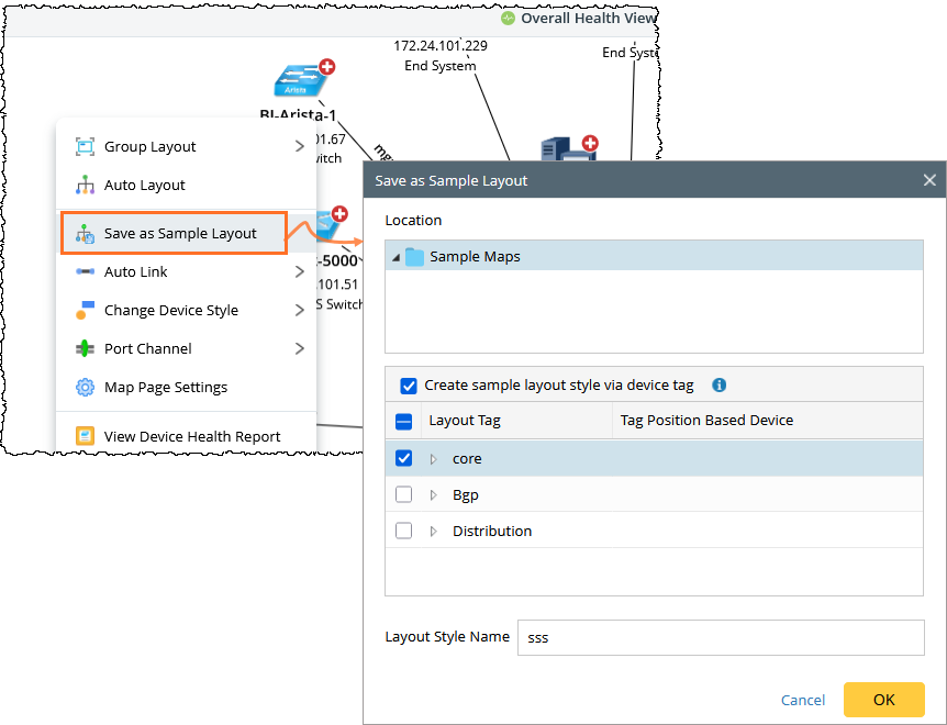 Use this feature to save the current layout of a map as a sample. You can save it based on device positions or layout tags. This makes it easy to reuse the layout for similar maps in the future.