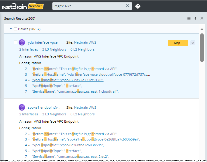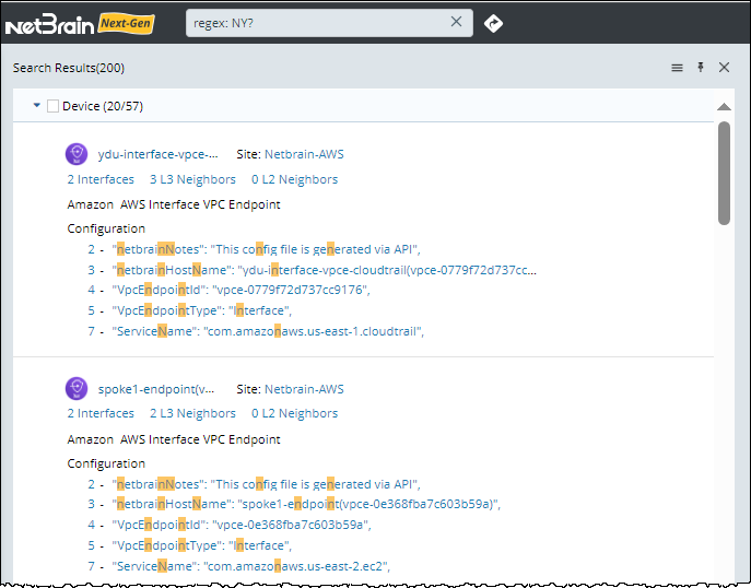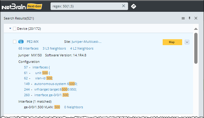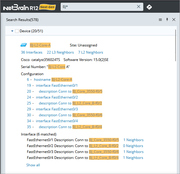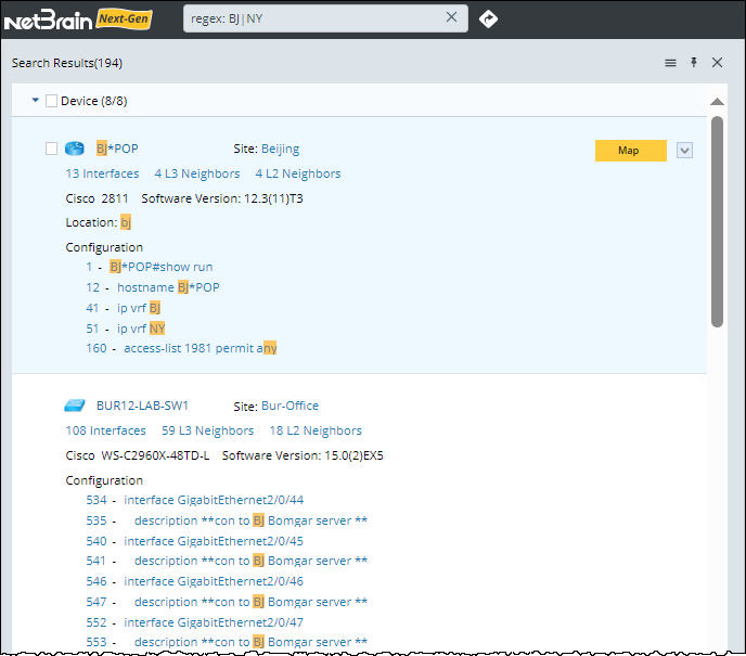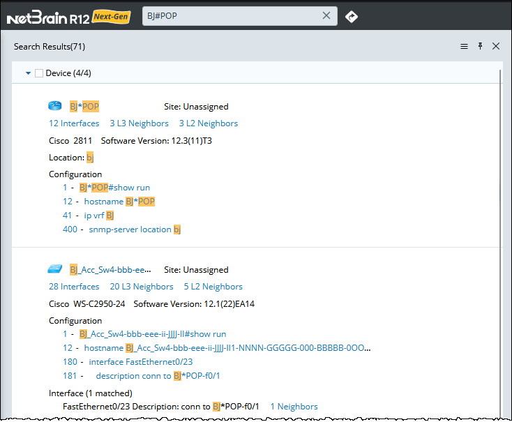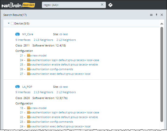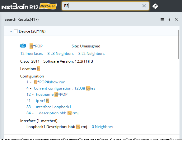 Note: Device config texts may contain "{" and "}". When searching for the device with keywords containing "{" and "}" (for example, "BGP {"), "{" and "}" will not be treated as a separator. |
