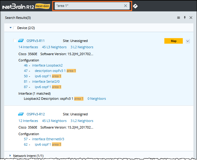 | ospf (process-id) area $area_ID | Returns devices whose interfaces are configured with the specific OSPF area ID. |