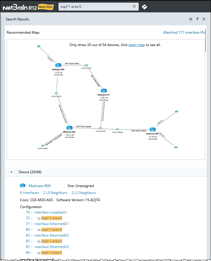 Note: The recommended map in search results shows at most 20 devices and 10 links for each device (including those links connected through a media). - Click Open Map to view all the devices and links.